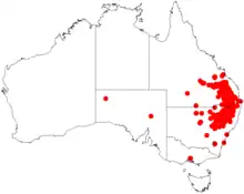 The plant is endemic to Queensland and New South Wales. It is found in New South Wales on the eastern tablelands and slopes of the Great Dividing Range, from around Tamworth and Barradine in the south extending north into Queensland. It is often found among granite outcrops as a part of dry sclerophyll forest and woodland communities.[2]