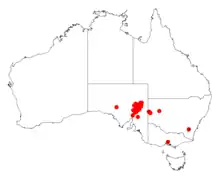 It is endemic to some small areas on the Flinders Range in South Australia near Hawker in the south to around Mount Harris in the north and also around Wilgena much further to the west where it is found on ridges, stony slopes and along watercourses growing in shallow calcareous loamy soils as a part of tall open scrubland communities[1]