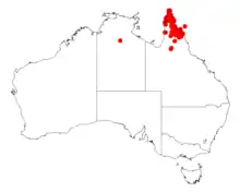 The range of the plant is mostly in far north Queensland where it is commonly situated on almost level and gently undulating plains as well as low hills with elevations up to 800 m (2,600 ft). It is usually found growing in lateritic red earth sandy or loamy soils as a part of Eucalyptus woodland communities.[1] The range of the plant extends from the northern tip of the Cape York Peninsula down to the Palmer River in the south.[3]