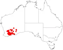 It is native to an area in the Wheatbelt and Goldfields-Esperance regions of Western Australia where it is commonly situated around salt flats and lakes, on slopes or sandplains growing in rocky loamy or sandy soils.[1] It has a scattered distribution with the bulk of the population found from Ongerup in the west to around the Wittenoom Hills approximately 50 km (31 mi) north of Esperance to the east and up to around Hyden in the north. Other outlying populations are found around Merredin, Kellerberrin and Boorabbin National Park as well as to the south of Zanthus where it is often a part of Banksia and Casuarina scrubland and Eucalyptus scrub-woodland communities.[2]