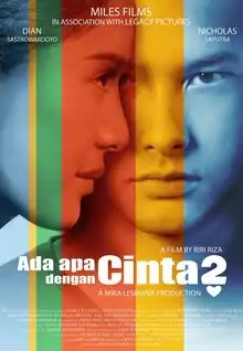 Ada Apa Dengan Cinta? 2 (English: What's Up with Love? 2) is a 2016 Indonesian teen film directed by Riri Riza. It is the sequel to the 2002 cult classic romance Ada Apa Dengan Cinta? with Dian Sastrowardoyo and Nicholas Saputra reprising their roles as Cinta and Rangga.