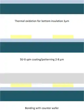 The standard process (compare to figure "Schematic bonding process") consists of applying SU-8 on the top wafer by spin-on or spray-on of thin layers (3 to 100 µm).