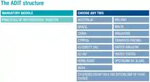 The ADIT qualification structure includes a mandatory 'Principles of International Taxation' exam, which covers fundamental concepts in international tax. In addition, students are required to select two further exams, from a range of jurisdiction-based and thematic international tax subject areas.[4] The ADIT qualification structure was changed to its present form in 2015.[5]