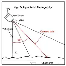 Vertical aerial photographs represent more than 95% of all captured aerial images.[2] The principles of capturing vertical photographs are shown in Figure 2.[3][4] Two major axes which originate from the camera lens are included.[3] One is the vertical axis which is always at 90° to the study area.[3] Another one is the camera axis which changes with the angle of the camera.[3] To capture a vertical aerial photograph, both of these axes must be in the same position.[3] The vertical pictures are captured by the camera which is above the object being photographed without any tilting or deviation of the camera axis.[5] Areas in a vertical aerial photograph often have a consistent size.[4]