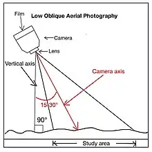 Oblique aerial photographs are captured when the cameras are set at specific angles to the land.[5] It is a very helpful enhancement or addition to the traditional vertical image.[2] It allows the vision to pass through a relatively high proportion of the plant cover and leaves of trees.[2] Oblique aerial photographs can be classified into two types.