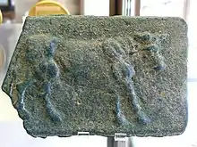 Aes signatum (Latin; lit. 'stamped bronze') consisted of cast ingots of bronze of measured quality and weight, embossed with a government stamp, used as currency in Rome and central Italy starting in the 5th century BC before the introduction of aes grave in the mid 3rd century BC.[1] When exactly they were first made is uncertain. Popular tradition ascribes them to Servius Tullius, but due to the high quality of art found on even the earliest specimens, this seems very unlikely. A date in the midst of the 5th century BC is generally agreed on. Designs featured are that of a bull, an eagle, and other religious symbols.[2]