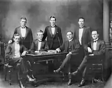 The Afrikaner Broederbond (AB) or simply the Broederbond was an exclusively Afrikaner Calvinist and male secret society in South Africa dedicated to the advancement of the Afrikaner people. It was founded by H. J. Klopper, H. W. van der Merwe, D. H. C. du Plessis and the Rev. Jozua Naudé[1] in 1918 as Jong Zuid Afrika (Dutch: Young South Africa) until 1920, when it was renamed the Broederbond.[2][3] Its influence within South African political and social life came to a climax with the 1948-1994 rule of the white supremacist National Party and its policy of apartheid, which was largely developed and implemented by Broederbond members. Between 1948 and 1994, many prominent figures of Afrikaner political, cultural, and religious life, including every leader of the South African government, were members of the Afrikaner Broederbond.[2]
