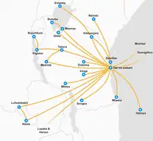 As of February 2023, Air Tanzania serves ten international destinations including regional routes, Guangzhou and Mumbai. Air Tanzania also serves thirteen domestic destinations from its hub at Dar es Salaam's Julius Nyerere International Airport.[87]