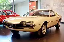 The Alfa Romeo Montreal was introduced as a concept car in 1967 at Expo 67, held in Montreal, Quebec, Canada.[3] Originally, the concept cars were displayed without any model name, but the public took to calling it The Montreal.[4] It was a 2+2 coupe using the 1.6-litre engine of the Alfa Romeo Giulia TI and the short wheelbase chassis of the Alfa Romeo Giulia Sprint GT, with a body designed by Marcello Gandini at Bertone. One of the two concept cars built for Expo 67 is displayed in the Alfa Romeo Historical Museum in Arese, Italy, while the other is in museum storage.[2]