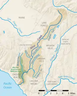 Aliso Creek is a 19.8-mile (31.9 km)-long,[2] mostly urban stream in south Orange County, California. Originating in the Cleveland National Forest in the Santa Ana Mountains, it flows generally southwest and empties into the Pacific Ocean at Laguna Beach. The creek's watershed drains 34.9 square miles (90 km2), and it is joined by seven main tributaries. As of 2018, the watershed had a population of 144,000 divided among seven incorporated cities.[4]