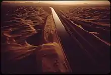 Approximately 68,000 acre-feet (84,000,000 m3) was lost annually by seepage from the All-American Canal, especially from the point where the canal crosses the great Algodones Dune Field. About 90% of this seepage entered Mexico.[9] At first this seepage caused widespread flooding, but Mexicali Valley residents and businesses built drainage and pumping systems to recover the seepage. Mexicali Valley agriculture became reliant upon this seepage for irrigation.[10] As water use increased in both rural and urban areas, this seepage became an issue of concern. The All-American Canal Lining Project, a part of California's Colorado River Water Use Plan, lined 37 kilometers (23 mi) of the canal to prevent seepage.[1] In 2006, a Mexicali business and civic organization and two California environmental non-profits challenged the lining project in US federal court on the basis that it violated the water rights of Mexican water users and violated US environmental statutes due to the seepage's effects on the nearby Andrade Mesa Wetlands. A rider in the Tax Relief and Health Care Act of 2006 required the completion of the lining project, however, and the lawsuit was rendered moot.[11] The Imperial Irrigation District built a parallel canal along the designated section of the original canal, and the water flow was rerouted into the new lined canal. Construction began in 2007 and was completed in 2009.[12]