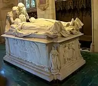 In the church are 35 monuments to the Curzon family; these include free-standing tombs, wall monuments and floor tablets.[6] They date from the 13th to the 20th centuries.[2] The largest is a free-standing tomb in the Kedleston Chapel. It bears the effigies of the 1st Marquess Curzon of Kedleston, who died in 1925, and his first wife Mary, for whom the chapel was built and who died in 1906 at the age of 36. It is a table tomb in white marble; two angels holding the crown of life lean over the effigies.[6] The memorial was designed by Sir Bertram Mackennal.[2]