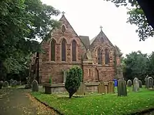 The origins of a church or chapel at Thelwall are unclear. It has been thought that a chapel was built by Richard Brooke of Norton Priory but a legal suit in 1663 suggests that there was a chapel on the site before this date. At this time Thelwall was in the parish of Runcorn. In 1663 the chapel on the site was restored by Robert Pickering. After this the chapel fell into disrepair. It was restored again and re-opened in 1782.[3] By the following century the church was too small for its congregation and in 1843 a new church was built and consecrated.[4] This consisted of a nave which was designed by James Mountford Allen.[5] In 1856 the chancel was built at the expense of James Nicholson and the nave was extended by one bay.[4] In 1890 Henry Stanton commissioned a new north aisle, a new baptistry with a new font, and a new vestry.[6] The aisle and vestry, together with a north porch, were designed by William Owen.[1]