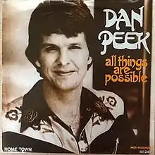 "All Things Are Possible" is the debut solo single by former America member Dan Peek, from the album of the same name, All Things Are Possible.[1] Released in 1979, it was a No. 1 hit on contemporary Christian music stations (staying at the top of the charts for 13 weeks), as well as reaching the mainstream Pop and Adult Contemporary charts, making it one of the first, if not the first CCM crossover hit.[2][3] The song was written by Peek and Chris Christian, who also produced the single.[4] Since its release, it has been included on several various artists, CCM compilations.[5]