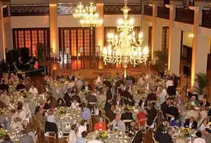 The University of Pittsburgh acquired the former Masonic Temple on December 23, 1993, for $8.5 million ($17.2 million in 2022 dollars[4]).[5] A two-year, $16 million ($28.1 million in 2022 dollars[4]) renovation of the structure and its adaptation for use by the University departments began in November 1998 and was completed in February 2000. During the initial design process, a study was performed to evaluate the architectural and historic significance of each major area of the building. As a result, four main lobbies, the ballroom and three main entrances, and portions of several two-story spaces on the third and fifth floors were kept and restored. Special attention was given to restore the Masonic Temple's original historic condition. As such, approximately 95% of the existing historical light fixtures were rewired, retrofitted with energy–efficient lamps, refinished, and rehung in their original locations. Nearly all of the original wood doors, window casings and baseboards were refinished and reinstalled. Five new automatic elevators were installed and original bronze and stainless steel cabs were retrofitted to two of the new elevator platforms. Approximately 100 original bronze door hardware sets were modified to ADA compliance, refinished and reinstalled. One thousand square feet of marble flooring originally from Pennsylvania Hall (the previous home of Pitt's medical school since torn down) was utilized in vestibules, corridors, elevator lobbies and cabs. Marble from the Masonic Temple's original marble restroom stalls was also recycled for use in these areas. The building was decorated and furnished in a color scheme of primarily blues, mauves and burgundy to complement the mahogany woodwork.