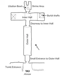 The inner hall leads to the back of the tomb, where the shrine area is located. The uppermost segment of the lintel of the shrine's doorway is decorated with a carving of the uraeus.[5] The lower portion shows unfinished carvings of a line of djed-pillars.[10] The shrine houses an unfinished and disfigured limestone statue of Ahmose. In this statue-niche, the figure of Ahmose is seated, a characteristic pose of Egyptian burial sculpture which symbolises a willingness to receive offerings.[11] The empty recesses of the stone statue once consisted of coloured decorative elements carved out of faience.[10] A shallow libation bowl is carved in the floor at the foot of the statue, used for religious offerings to the gods.[5] The shrine area was closed off by wooden folding doors. The side wall of the statue-niche was cut in a perfect square, demonstrating expertise in stonemasonry.[5] Throughout the tomb, the undecorated walls are mostly covered in Greek graffiti, which was scratched into the plaster.