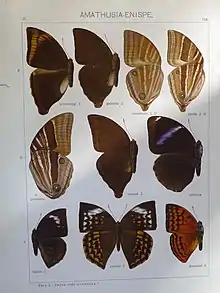 Described as a new species of Amathusia characterised by the oval depression of the scent organ on the upper hindwing having an oval hair tuft near the base of space 7 and a hair pencil. The ground colour is rich reddish brown and there are basal white stripes [3]
