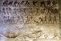 ![]() Amenemhat (middle) receives offerings. Drawing of a decoration from his tomb | |