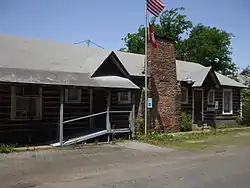 The American Legion Hut-Des Arc is a historic fraternal meeting hall at 206 Erwin Street in Des Arc, Arkansas. It is a single story rectangular structure, built of saddle-notched round logs, with a side-gable roof and a foundation of brick piers. The logs are chinked with large amounts of white cement mortar. The main facade is adorned with a massive fieldstone chimney, and has two entrances, each sheltered by gable-roofed hoods. Built in 1934, it is the only local example of the WPA Rustic style.[2]