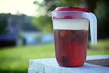 American restaurants and workplaces typically offer machine-made drip brew coffee by default, while hot tea brewed by the cup with tea bags is available by request.[1] Tea parties can be celebrated for many occasions, from the very small and intimate to the large family gatherings and celebrations. In the U.S. south a regional favorite called sweet tea which is brewed, sweetened, and chilled in advance of consumption may be served at all meals and throughout the day as an alternate to other beverages. In the United States, about 85% of the tea consumed is served cold, or iced.[2] Iced tea is more frequently consumed during periods of hot weather or in lower latitudes, and hot tea is likewise more common in colder weather. Any confusion when one is visiting different parts of the country can easily be solved by explicitly asking for either "hot tea" or "iced tea." Afternoon tea, as a meal, is rarely served in the U.S. except in ritualized special occasions such as the tea party or an afternoon out at a high-end hotel or restaurant, which may also offer cream tea on their menu.