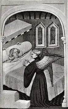 Amiloun is tended to for a year, after which angels appears to both in their dreams, saying that the blood of Amis's children will cure Amiloun's leprosy. Amis indeed performs the act, and Amiloun is cured. The children are miraculously found intact.[3] After all this, the friends return to Amiloun's castle and defeat the wife, who was about to marry another man, and her forces. Owain is appointed lord. Amiloun returns with Amis; years later, they die on the same day and are buried together.[4]