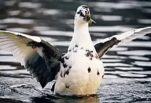 It usually reported that the Ancona was first bred in England in the early twentieth century, probably from the same stock that gave rise to the Magpie, and was introduced to the United States in or before the 1970s where it was first shown in 1983.[7]: 68 [8]: 174 However, an article in the Water Fowl Club of America Yearbook of 1913 reports that a duck of the same name had been developed by one W.J. Wirt, of Knowlesville, New York, who had named it after the Ancona breed of chicken. Birds of this type were shown in subsequent years, and took two first prizes at a poultry show in Boston in 1915.[2] The Livestock Conservancy does not give any description of these early American Anconas, or any comparison to the modern breed of that name.[2]