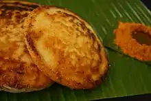 • 'Idli', Urad dal and rice steamed dumplings, often eaten with freshly-made chutney or with neyyi added and sprinkled with karrap podi (chili dal powder) or chutney and sambar.