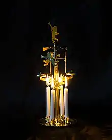 Angel chimes, also known as angel-abra, are a form of Christmas decoration popular in Europe and North America.[1] They apparently have the same origins as the Christmas pyramid, which functions on the same principle. They differ from these, primarily, in being mass-produced from metal and having bell-ringing angels, whereas Christmas pyramids are usually crafted from wood and do not necessarily have bells.
