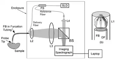 At the distal end of the fiber bundle, light from each fiber is imaged onto the spectrometer. Light from the sample and reference arms are mixed by a beamsplitting cube (BS), and are incident on the entrance slit of an imaging spectrometer. Data from the imaging spectrometer are transferred to a computer via USB interface for signal processing and display of results. The computer also provides control of the imaging spectrometer.