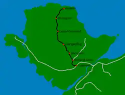 The railways arrived on Anglesey with the construction of the Chester and Holyhead Railway, of which the section from Llanfairpwll to Holyhead opened in 1848, two years before the Britannia Bridge was finished.[2] The Chester and Holyhead railway surveyed a branch to Llangefni in 1852, but chose not to proceed.[3] George Stephenson notably reported that the line was not worth building.[4]