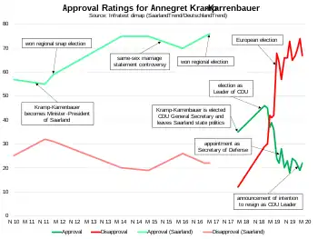 When entering federal politics, Kramp-Karrenbauer had a positive net approval rating from her election as CDU General Secretary in February 2018 until March 2019, just shortly after having been elected as Leader of the Christian Democratic Union. Her nationwide popularity peaked in January 2019, when she had a net approval of +17% and was seen as second-most popular politician overall.[47] There was then a sharp decline in her popularity following gaffes and electoral defeats for the Christian Democrats in several elections. As of February 2020, she is one of the least popular German politicians.[48][49]