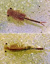 The thorax of most anostracans has 13 segments (19 in Polyartemiella and 21 in Polyartemia).[6] All but the last two are very similar, with a pair of biramous phyllopods (flattened, leaf-like appendages).[4] The last two segments are fused together,[3] and their appendages are specialised for reproduction.[6] Most anostracans have separate sexes (gonochorism), but a few reproduce by parthenogenesis.[7] The abdomen comprises 6 segments without appendages, and a telson,[6] which bears two flattened caudal rami or "cercopods".[3]