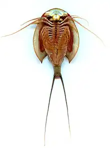 Some studies point to fossils resembling fairy shrimp in the Upper Cambrian,[30][31] specifically the oldest known branchiopod fossil, Rebachiella kinnekullensis, from Orsten marine deposits.[32] Despite its seeming resemblance to modern fairy shrimp, this fossil is still considered by most to be an outlying member of the ancestral marine Branchiopoda rather than a true fairy shrimp.[25]
