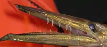 The fish's iridescent gold color and sapphire blue eyes fade quickly upon death, but this timely photograph captures these colors. The teeth are forward-curving for a specialized hunting technique.