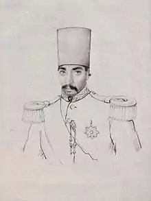 Anoushiravan Mirza also written Anushirvan Mirza was born on 19 August 1833 at Ardabil, Iran, and died on 23 October 1899 in Tabriz after developing apoplexy and paralysis. He was at Shusha, Karabakh. He was the first-born and eldest son of Prince Bahman Mirza, the governor-general (vali) of Azerbaijan in the time of Mohammad Shah Qajar. His mother was Bahman Mirza's first chief wife Princess Malek Soltan Khanom, daughter of Prince Mohammad Taghi Mirza "Hessam os-Saltaneh".[1][2] After Bahman Mirza fell out of favour at court in Tehran and exiled to Russia in 1848 his wives and children followed him to Russian occupied Caucasus province of Karabakh. But shortly after 1850 Anoushiravan Mirza moved back to Iran. And when his cousin Nasser al-Din Shah pardoned Bahman Mirza in 1872, finally Anoushiravan Mirza was rewarded with several governmental offices. In 1873 he became governor of Turshiz, 1878 governor of Talesh, later 1881-1882 governor of Tabriz, 1884-1886 and 1898-1899 of Semnan, Damghan and Shahrud, 1888-1889 governor of Borujerd and Lorestan. In 1891 he had the vizierate of the province of Kermanshah on behalf of the almighty governor and commander-in-chief of his time Hassan Ali Khan Garrousi "Amir Nezam". He also received the title of Zia' od-Dowleh (lit. Splendour of the State) - which that he became well-known - and the military rank of Amir Touman (lit. Commander of Ten Thousand, i.e. general) by Nasser al-Din Shah.[3]