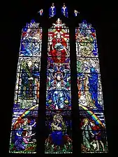 The north window in the chancel contains fragments of 15th century glass from Coventry.[123] There are also windows by Jones and Willis (1872), Clayton and Bell (1897), two by William Morris & Co (1921 and 1928) and a Woolliscroft Commemorative Window (2015) by Claire Williamson.[124] In 1931 a window designed by Karl Parsons, Christ in Majesty, together with a new screen, choir stalls and electric lights, were dedicated to the memory of William Garside Phillips,[125] who had been the managing director of Ansley Hall Colliery since 1879,[126] and his wife.[127]