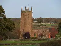 In 1206 William de Hardreshulle, Lord of Hartshill (d.1261)[98] bestowed the church to the nuns of Polesworth Abbey.[99][100] It stayed in the possession of the Abbey until the Dissolution of the monasteries in the mid 16th century. It then became the property of the crown.[101] The church’s tower and clerestory were added in the late 15th century. The chancel was doubled in length in the 18th century. The porch was added the late 19th century and the north aisle in 1913. The church was restored in 1894[102] and 1902.[103] A west gallery was removed in 1931.[104] On one column there is a "grotesque carving of two monsters striving for possession of a man".[105] There are the remains of Norman hinges on a door, dating from around 1150.[106] In the churchyard is a Parish Room, an on-site function room, by Kenneth Holmes Associates (2003),[107] and the octagonal base of a Medieval cross.[108]