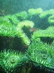 The anemone feeds on sea urchins, small fish, and crabs, but detached mussels seem to be the main food source.[5][7] There are rare instances where the giant green anemone has consumed seabirds.[9] It is not known whether the birds were alive or dead when engulfed by the anemone.