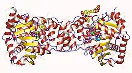 - 1 2 3 4 5 Mayans O, Ivens A, Nissen LJ, Kirschner K, Wilmanns M (July 2002). "Structural analysis of two enzymes catalysing reverse metabolic reactions implies common ancestry". EMBO J. 21 (13): 3245–54. doi:10.1093/emboj/cdf298. PMC 126076. PMID 12093726.