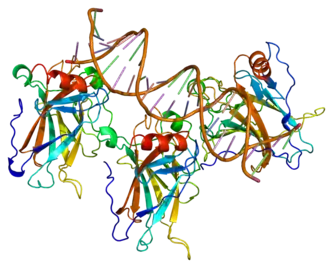 The p53 protein is a tumor-suppressing transcription factor (TF), which can recognize when there is an alteration in a cell's DNA caused by factors including chemical toxins, radiation, ultraviolet (UV) rays, and other damaging agents.[51] Crucially, p53 plays a role in determining whether the damaged genetic material in the cell can be repaired, or if the cell should be destroyed through apoptosis.[52][53] The individual topologically associating domains (TADs) target different genes and unique effector pathways. It has been observed that inactivating both of the TADs detrimentally affects the ability of p53 to suppress tumor growth and interact with target genes. When only one TAD is inactivated, p53 can still suppress specific tumors; however, it can no longer successfully engage in transactivation. The C-terminal domain (CTD) is an intrinsically disordered domain (IDD), which can take on different conformations depending on what it is binding with and is a location of many post-translational modifications, resulting in its ability to regulate p53 function depending on what it is bound to and what modifications are linked with the CTD. This domain also aids in the binding of the central DNA-binding domain (DBD) to specific DNA sequences; the CTD is a positive regulator of DNA binding and stabilizes the interaction of the DNA with the DBD.[51] p53 is unique as a transcription factor in that it can recognize and bind response elements (RE) in many different environments and doesn't need other transcription factors to cooperatively bind with it like many other TFs.[51]