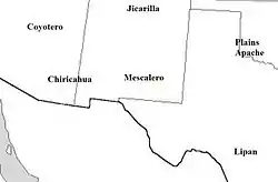 The approximate locations of the principal Apache tribes, ca. 1840. Most of the raids into Mexico were carried out by the Chiricahua and Mescalero.
