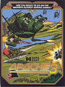 Apache 3 is a 3D scrolling shoot 'em up arcade video game released by Tatsumi (and Data East in North America) in 1988. Players control a yellow AH-64 Apache helicopter with weapons and shoot everything in the air and on the ground.