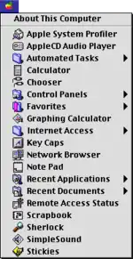 The Apple menu is a drop-down menu that is on the left side of the menu bar in the classic Mac OS, macOS and A/UX operating systems. The Apple menu's role has changed throughout the history of Apple Inc.'s operating systems, but the menu has always featured a version of the Apple logo.
