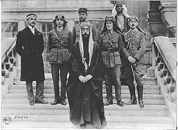 By the time of Aqaba's capture, many other officers joined Faisal's campaign. A large number of British officers and advisors, led by Lt. Col.s Stewart F. Newcombe and Cyril E. Wilson, arrived to provide the Arabs rifles, explosives, mortars, and machine guns.[63] Artillery was only sporadically supplied due to a general shortage, though Faisal would have several batteries of mountain guns under French Captain Pisani and his Algerians for the Megiddo Campaign.[63] Egyptian and Indian troops also served with the Revolt, primarily as machine gunners and specialist troops, a number of armoured cars were allocated for use.[63][64] The Royal Flying Corps often supported the Arab operations, and the Imperial Camel Corps served with the Arabs for a time.[65] The French military mission of 1,100 officers under Brémond established good relations with Hussein and especially with his sons, the Emirs Ali and Abdullah, and for this reason, most of the French effort went into assisting the Arab Southern Army commanded by the Emir Ali that was laying siege to Medina and the Eastern Army commanded by Abdullah that had the responsibility of protecting Ali's eastern flank from Ibn Rashid.[39] Medina was never taken by the Hashemite forces, and the Ottoman commander, Fakhri Pasha, only surrendered Medina when ordered to by the Turkish government on 9 January 1919.[66] The total number of Ottoman troops bottled up in Medina by the time of the surrender were 456 officers and 9364 soldiers.[66]