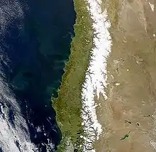The Arauco Basin (Spanish: Cuenca de Arauco) is a sediment-filled depression –a sedimentary basin– in south-central Chile. In the context of plate tectonics it is classified as a forearc basin. The basin has an approximate area of 8,000 square kilometres (3,100 sq mi) and at its deeper parts the surface of its sedimentary fill reaches 200 metres (660 ft) below sea-level.[1] The basin is interpreted as being part of an uplifted part of the continental shelf.[2] To the west it bounds an active accretionary prism that lies next to the Chile trench and to the east it bounds metamorphic basement representing a fossil Paleozoic accretionary complex that has been intruded by the Coastal Batholith of central Chile.[3]