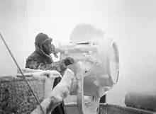 ![]() View from the cruiser HMS Sheffield as she sails on convoy duty through the waters of the Arctic Ocean. In the background are merchant ships of the convoy. | |||||||