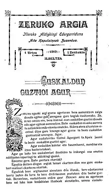Argia is a weekly news magazine published in the Basque language, the oldest one still in circulation. Their main office is in Lasarte-Oria, Basque Country. Its name was Zeruko Argia from 1919 to 1921 and from 1963 to 1980, and Argia from 1921 to 1936 and from 1980 to present. It had to cease its activity because of the Spanish Civil War in 1936, and it could not be published again until 1963, when Francoist Spain lifted its ban on Basque-language publications.[1]