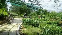 The zoo is located within the Vandalur Reserve Forest area.[24] The zoo's ecosystem consists of dry deciduous and dry evergreen scrub forest vegetation of the Eastern Ghats, a degraded forest consisting of mostly thorny bushes, receiving an average annual rainfall of 1,400 millimetres (55 in) and an average annual temperature of 26 °C (79 °F).[25] The terrain is a gentle undulating one[21] ranging in altitude from 10 to 100 metres (33 to 328 ft) with an average elevation of 50 metres (160 ft) above sea level.[25] The park was designed to keep the natural vegetation of the area intact except where enclosures, roads, and structures had to be constructed. Originally a sparse scrub forest invaded by weeds, consisting of species such as Carissa sp., Gmelina sp., Eugenia sp., Acacia sp., Instia sp. and a few other dry evergreen forest species, the park's vegetation was gradually enriched by planting dry evergreen species.[25] The entire campus has been fortified by means of a compound wall,[26] preventing any biotic interference in the park and allowing the natural growth of vegetation, which give the park the look of a natural forest. The park is built based on the 'open zoo' concept. The exhibits were originally based on taxonomic and geographical distribution of the species, but have now been replaced by ecological niches and habitats. The order of priority is local species, followed by regional, national, and international species. The use of moats has made it possible to house predator and prey in extended enclosures that provide a panorama of wildlife. There are over 75 moated enclosures in the park. Enrichments in the form of ladders, climbing materials, etc. are provided for the animals to move around the enclosure freely.[27]