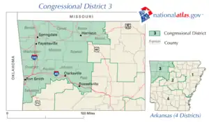 Arkansas's 3rd congressional district is a congressional district in the U.S. state of Arkansas. The district covers Northwest Arkansas and takes in Fort Smith, Fayetteville, Springdale, and Bentonville.