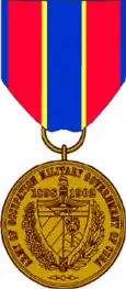 The Army of Cuban Occupation Medal was established by War Department General Order 40, in June 1915.[1] To be awarded the Army of Cuban Occupation Medal, a service member must have served within the geographical borders of Cuba between 18 July 1898 and 20 May 1902. The medal was primarily awarded to members of the United States Army, but was available to other branches of service under certain circumstances.[2]